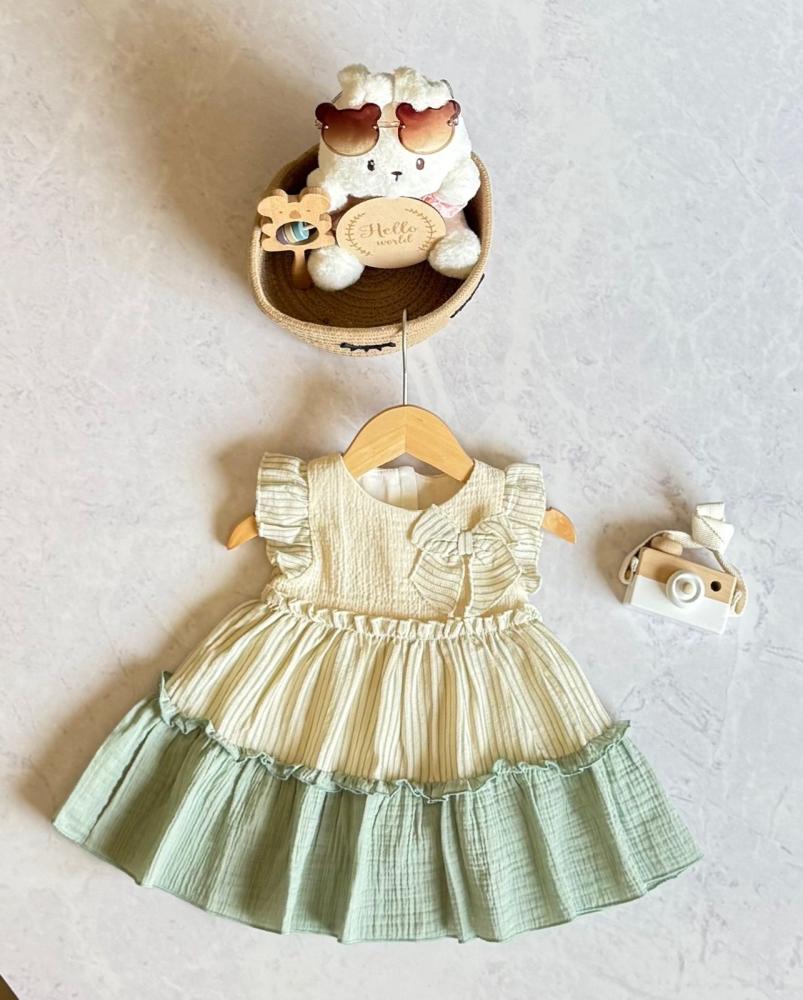 فستان صيفي بسيط وأنيق مثالي لفصل لحرارة الصيف، مصنوع من قماش قطني مريح وخفيف، مع تصميم بطبقات متموجة وأكمام كشكش، ولمسة فيونكة جانبية تضيف جمالاً ناعماً للمظهر.