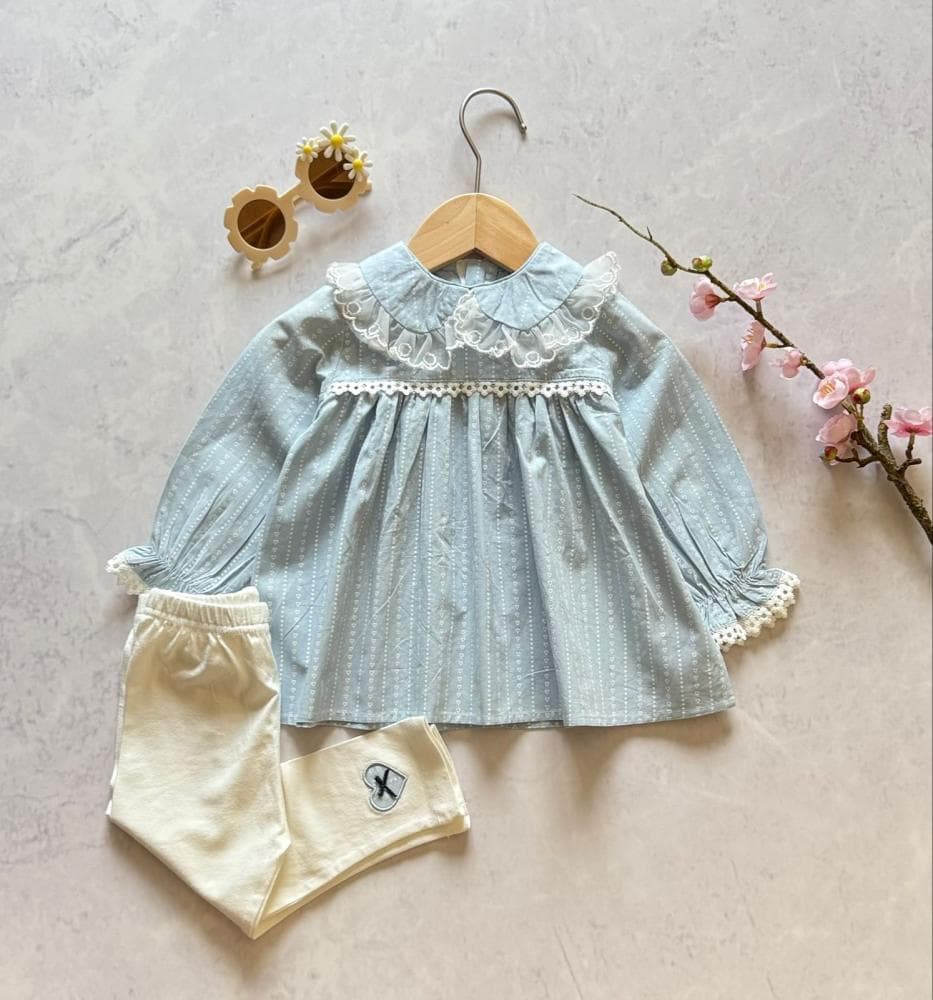 تصميم الأكمام الطويلة والياقة المزخرفة يضيف شخصية جذابة دون الإفراط في التفاصيل بينما يحافظ البنطال الأبيض الملحق على تنسيق الألوان بشكل جميل ويمكن ارتداء الفستان بمفرده أو مع إكسسوار بسيط مثل ربطة شعر مناسبة ليكتمل شكل الإطلالة العصرية لصغيرتك فالفستان مناسب للنزهات اليومية والمناسبات الصغيرة ويتيح للأمهات إمكانية اختيار فساتين أطفال رضع بألوان هادئة تناسب جميع الأذواق.