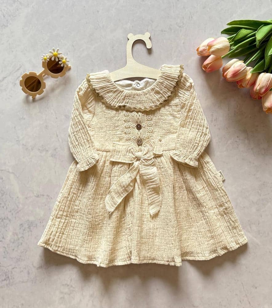 الفيونكة عند الخصر تمنح الطفلة مظهر لافت يناسب الاحتفالات الخاصة والجلسات العائلية فتصميم الفستان يسمح بحرية الحركة وسهولة ارتدائه مع أزرار خشبية طبيعية لتسهيل الاستخدام.