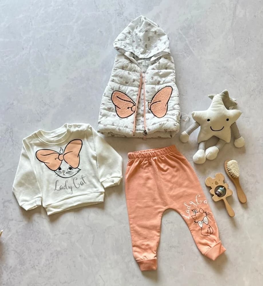 يتميز هذا الطقم بتصميم الرائع المكون من ثلاثة قطع تشمل جيليه مبطن وكنزة بناتي وبنطال قطني، ليمنح طفلتك شعور قوي بالدفء طوال فصل الشتاء.