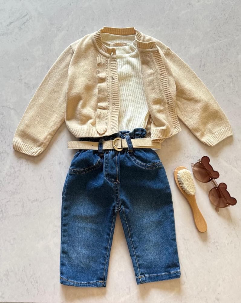 يعد هذا الطقم من أميز قطع ملابس اطفال بنات للعيد في متجر بي تريند حيث يتكون الطقم من جاكيت صوف بلون بيج مع أزرار أمامية، وبدي قطني أبيض ناعم، وبنطال جينز أزرق مزود بحزام بلون بيج، هذا الطقم يعد مناسب لطفلتك في الخروجات اليومية والزيارات العائلية.