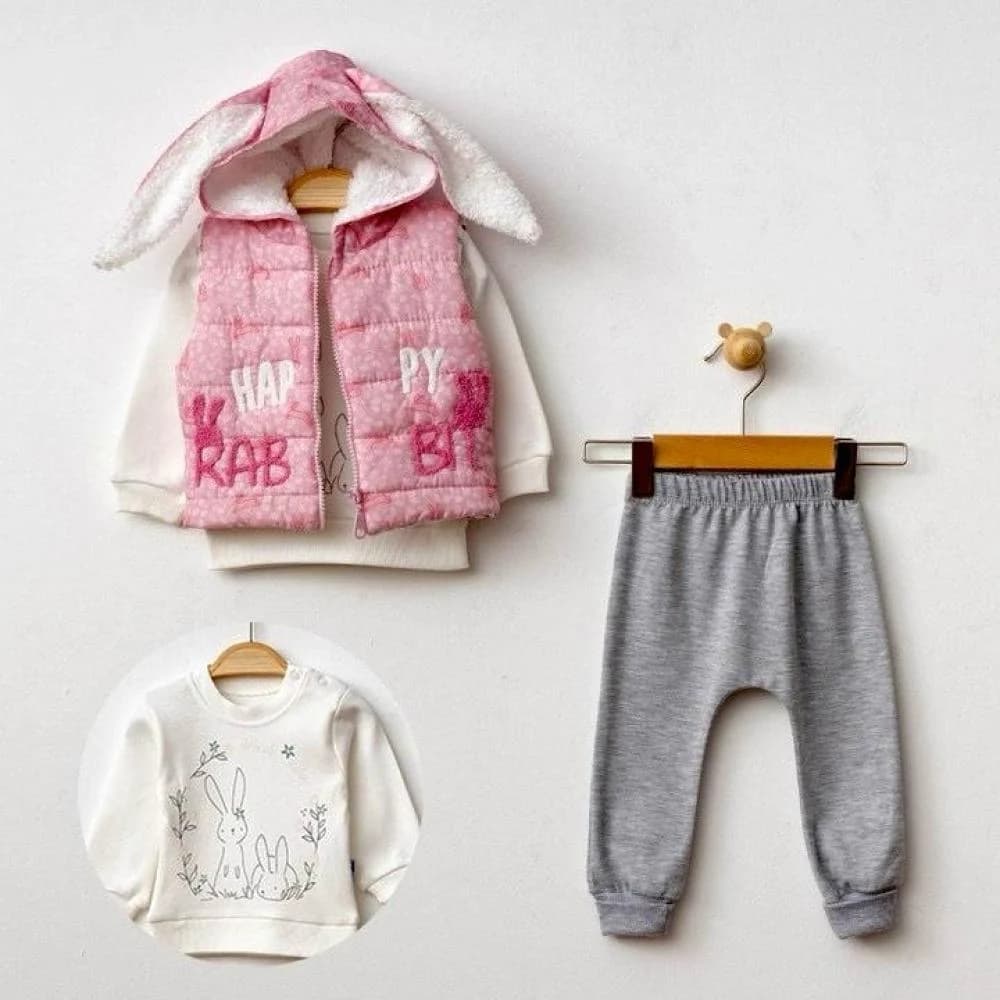 طقم خروج بيبي بناتي شتوي 3 قطع بقبعة أرنب ودفء ناعم