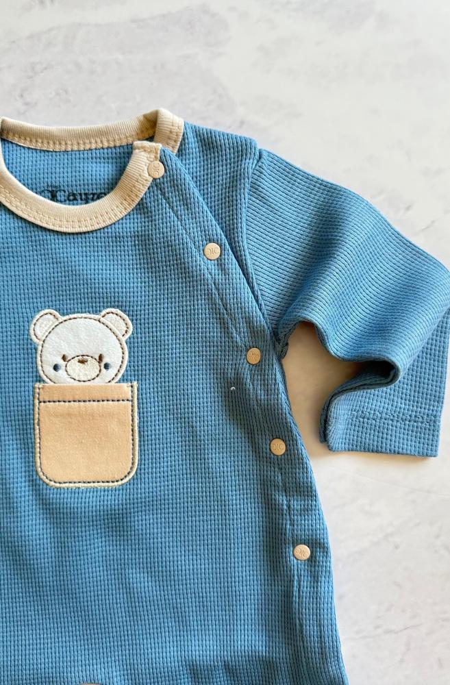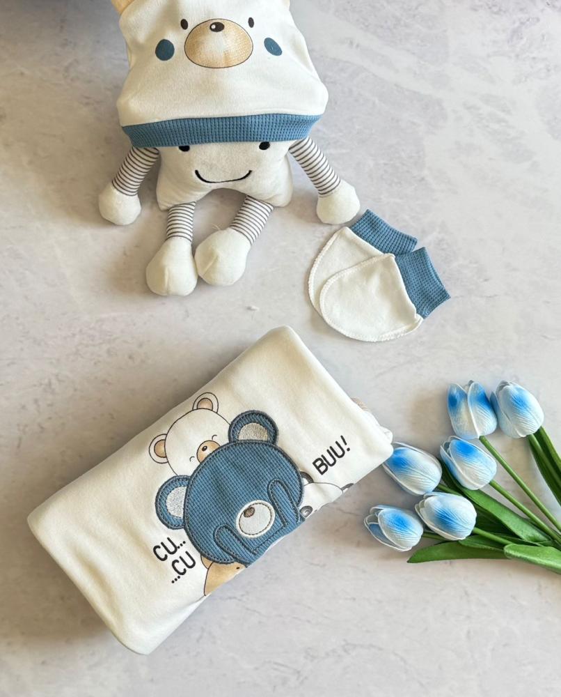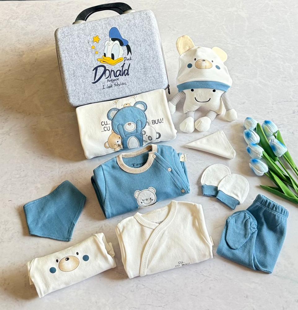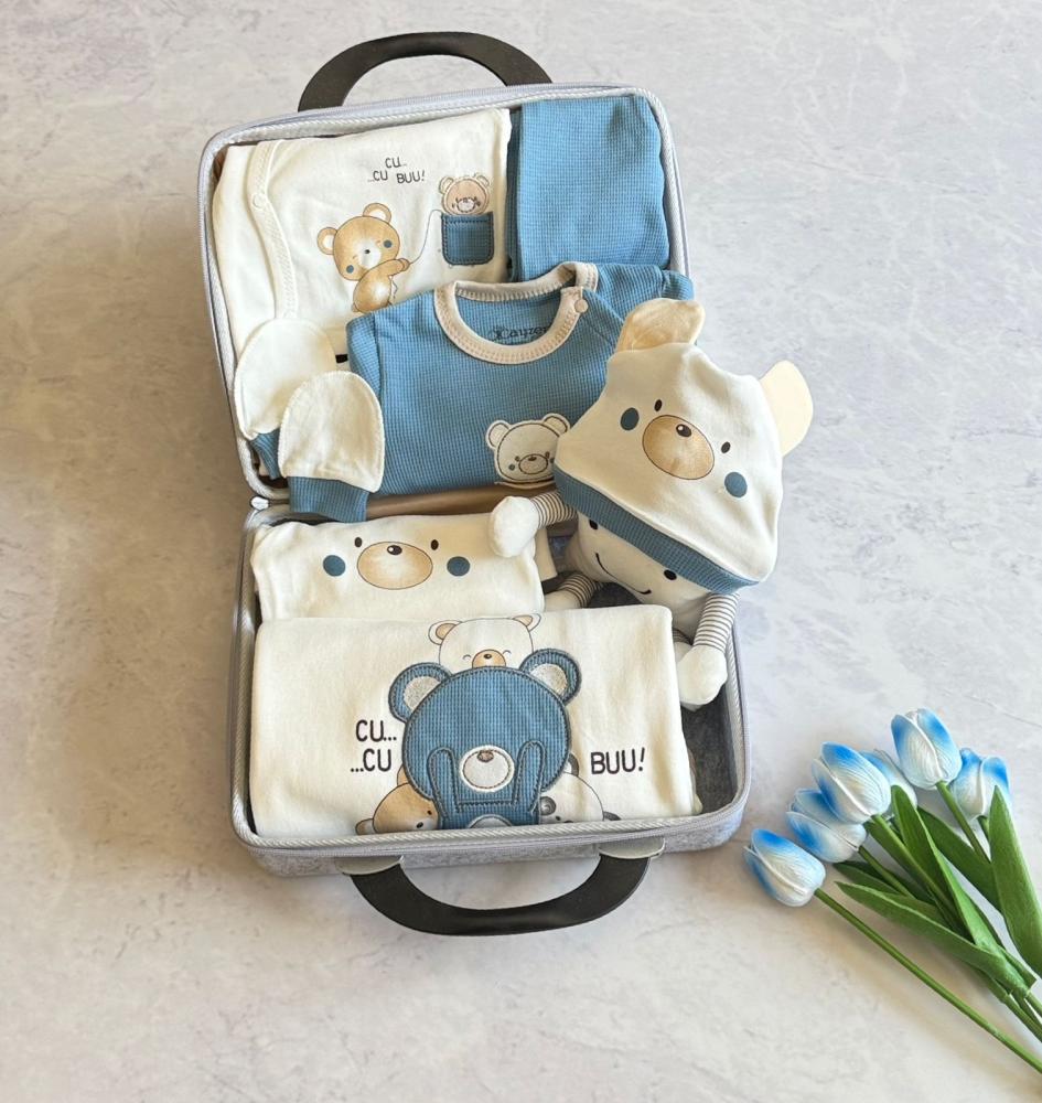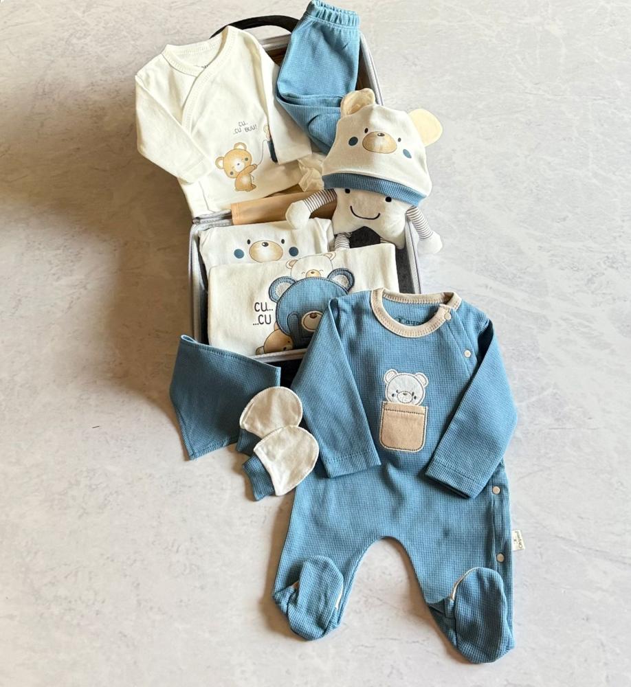 استقبلي مولودك بأناقة مع بوكس ملابس مواليد برسمة دب المصنوع من القطن العضوي 100٪، ليمنح صغيرك راحة استثنائية وملمسًا ناعم وآمن على بشرته الحساسة. تصميم الدب الأزرق الباستيل يضفي لمسة من البراءة والدفء على أولى أيام طفلك، ويجعله خيارًا مثاليًا كهدية مواليد فخمة للأمهات الجدد.