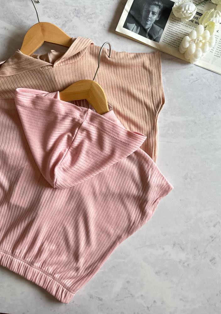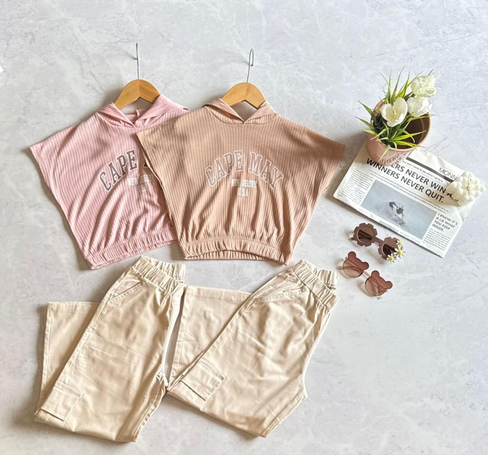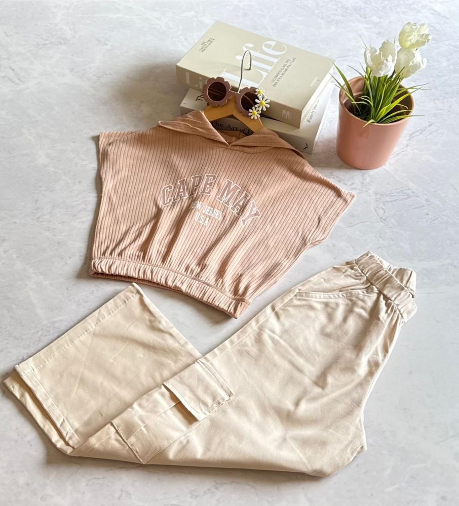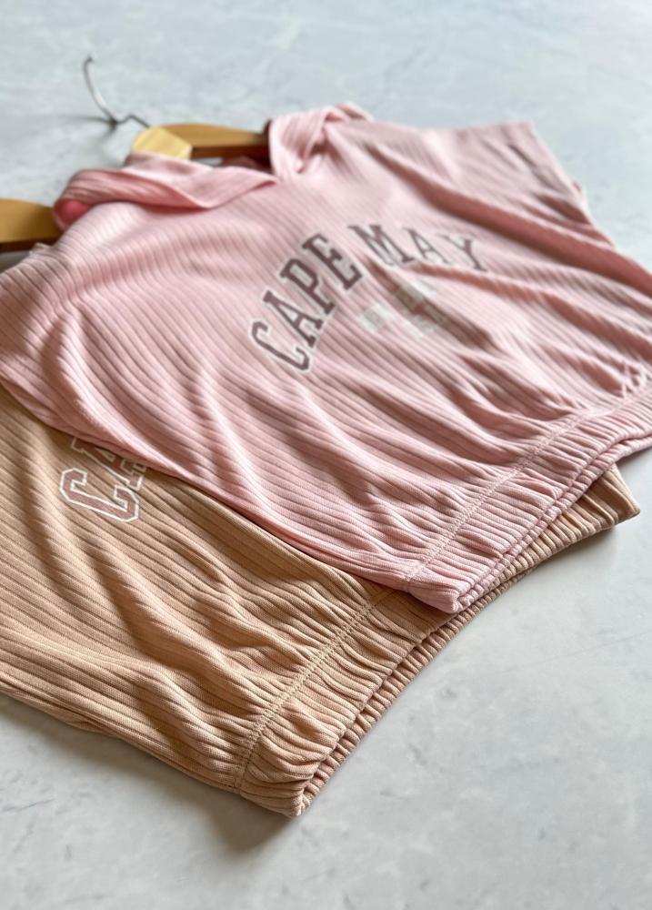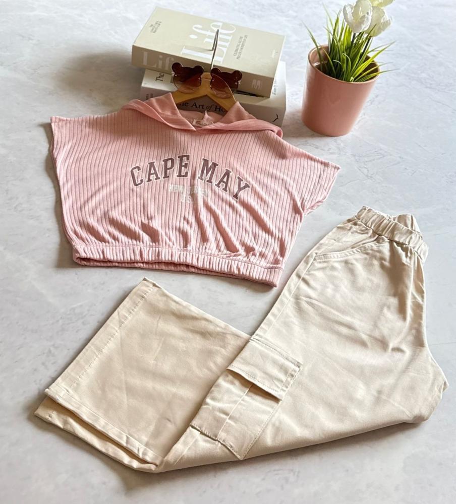 - Top: Short-sleeved cropped hoodie made of ribbed cotton, featuring a casual design with "CAPE MAY" print on the chest. Available in light pink and soft beige.